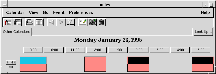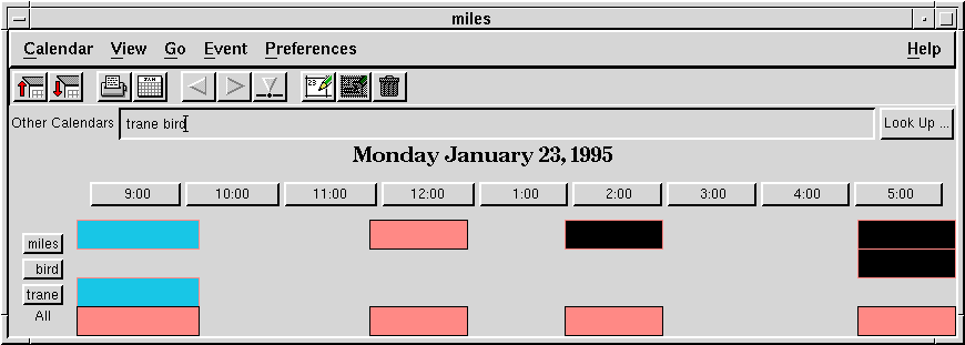 Each calendar name is contained in a button at the left of the grid. Clicking this button will give a brief summary of the calendar events. Empty space indicates free time. At the bottom of the grid, an empty space in the ``All'' column indicates a block of time that is free for all users. In the example above, all calendars are open from 10:00 to 12:00, 1:00 to 2:00, and 3:00 to 5:00.